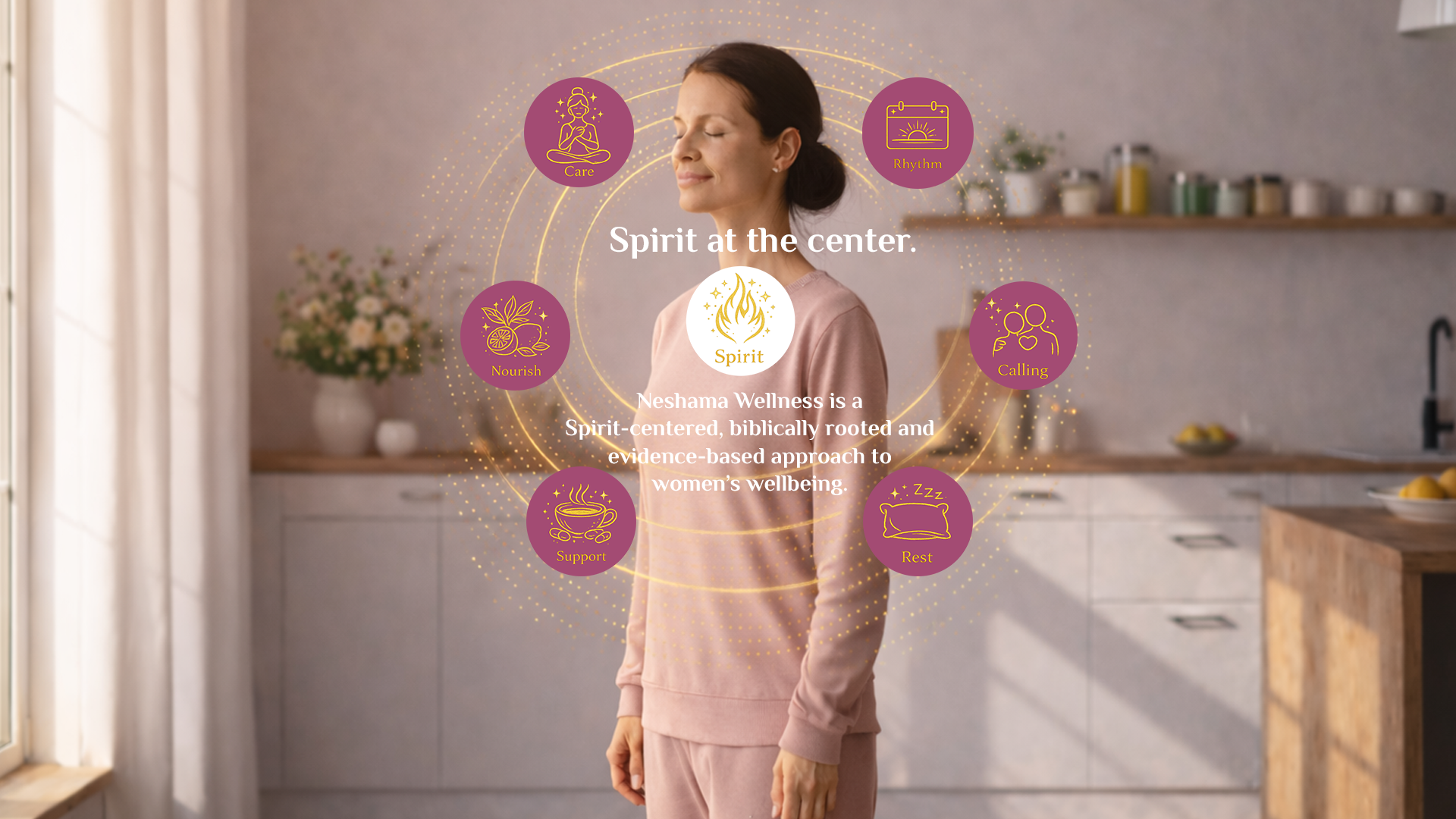Neshama Wellness is a Spirit-centered, biblically rooted and evidence-based approach to women’s wellbeing. At the heart is Spirit — our connection with God, nurtured through prayer, Scripture, worship, and gratitude. Surrounding this center are six practices that support embodied life: Care, Nourish, Support, Rest, Rhythm, and Calling. Spirit sustains us in every circumstance. These practices help us live well, serve others, and steward the body that God has given us. Neshama (נשמה) is a Hebrew word meaning “soul” or “breath,” representing the divine, immortal spark within a human being. Everything flows from there.